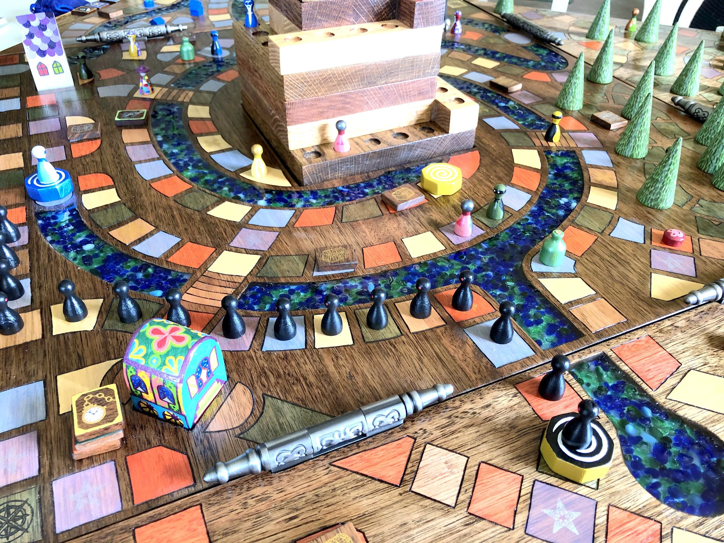 The gameboard is finished. It weighs in at close to 30 lbs. When it is unfolded, the kingdom is 32” x 32”… which takes up quite a lot of room on the table. The mountain in the middle is 10” tall with 12 separate levels, topped with a golden throne. There are over 400 spaces on the board, roughly 4 linear feet of sparkling river painstakingly filled with a glossy ‘bar-top’ glaze, and several unique destinations including a Dark Forest, 4 distinct Strongholds, 5 permanent Landmark locations, and dozens of specially-stamped spaces which all play their part.